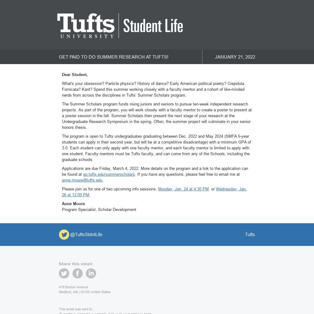 What's your obsession? Particle physics? History of dance? Early American political poetry? Crepidula Fornicata? Kant? Spend this summer working closely with a faculty mentor and a cohort of like-minded nerds from across the disciplines in Tufts’ Summer Scholars program.
