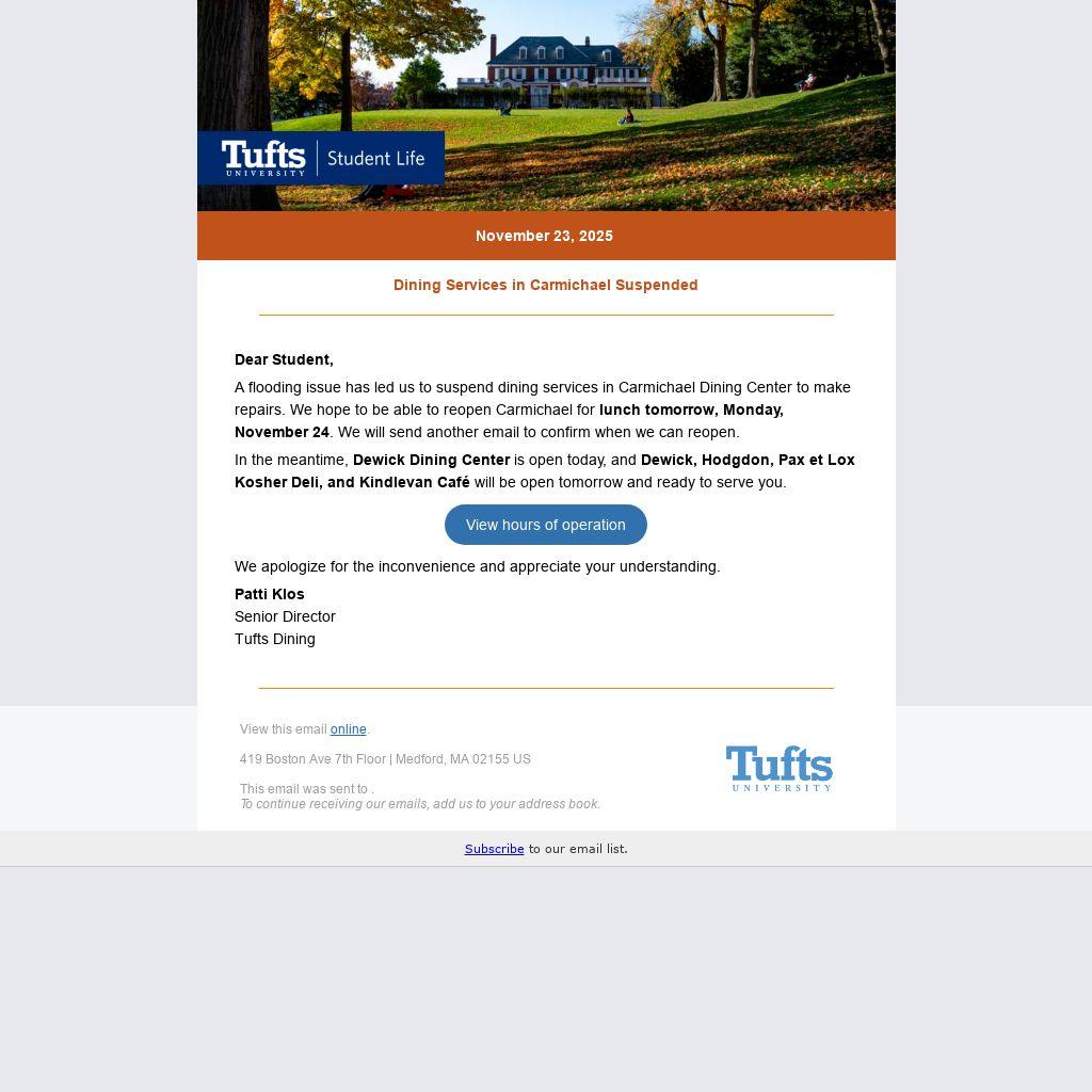 A flooding issue has led us to suspend dining services in Carmichael Dining Center to make repairs. We hope to be able to reopen Carmichael for lunch tomorrow, Monday, November 24. We will send another email to confirm when we can reopen.