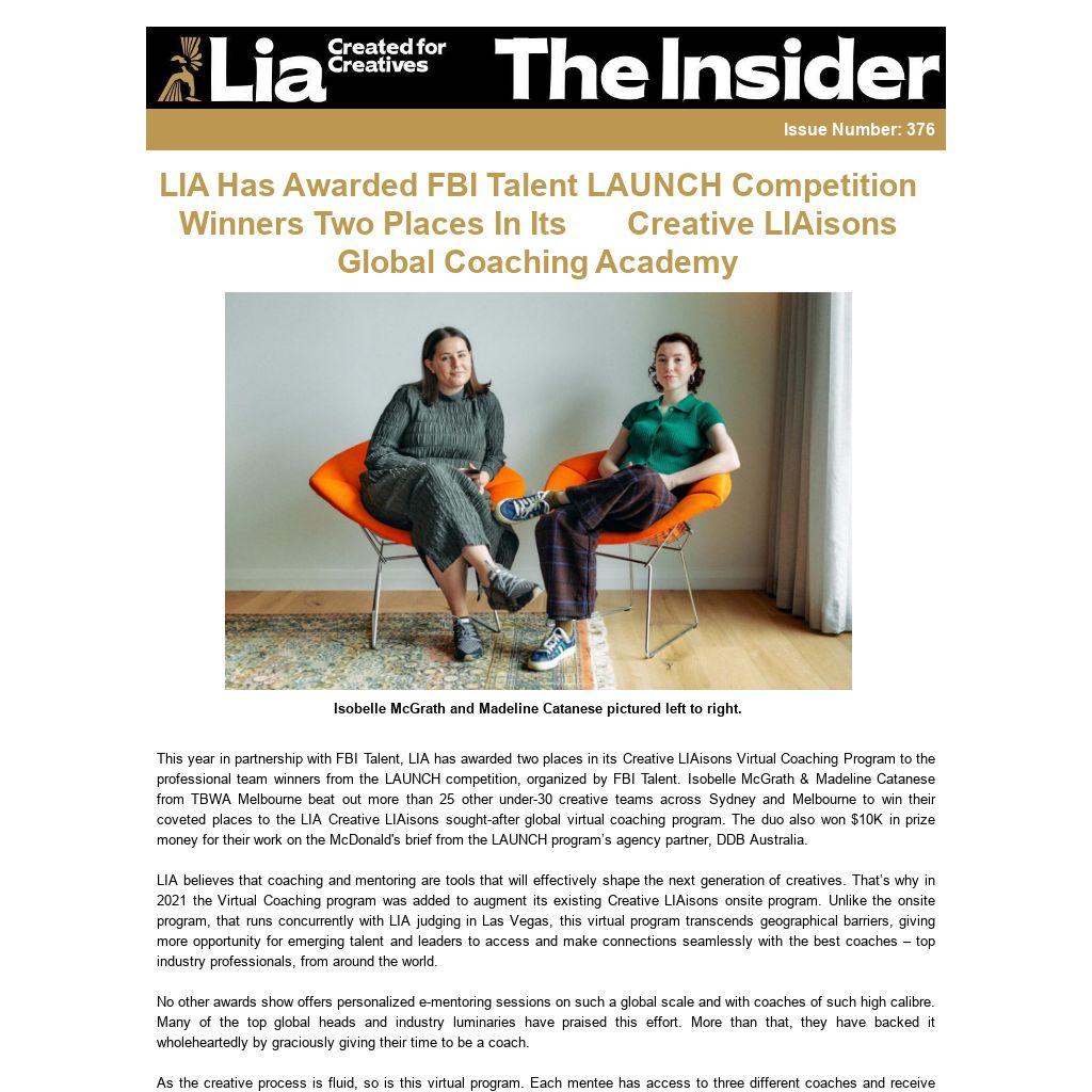 This year in partnership with FBI Talent, LIA has awarded two places in its Creative LIAisons Virtual Coaching Program to the professional team winners from the LAUNCH competition, organized by FBI Talent. Isobelle McGrath & Madeline Catanese from TBWA Melbourne beat out more than 25 other under-30 creative teams across Sydney and Melbourne to win their coveted places to the LIA Creative LIAisons sought-after global virtual coaching program. The duo also won $10K in prize money for their work on the McDonald's brief from the LAUNCH program’s agency partner, DDB Australia.