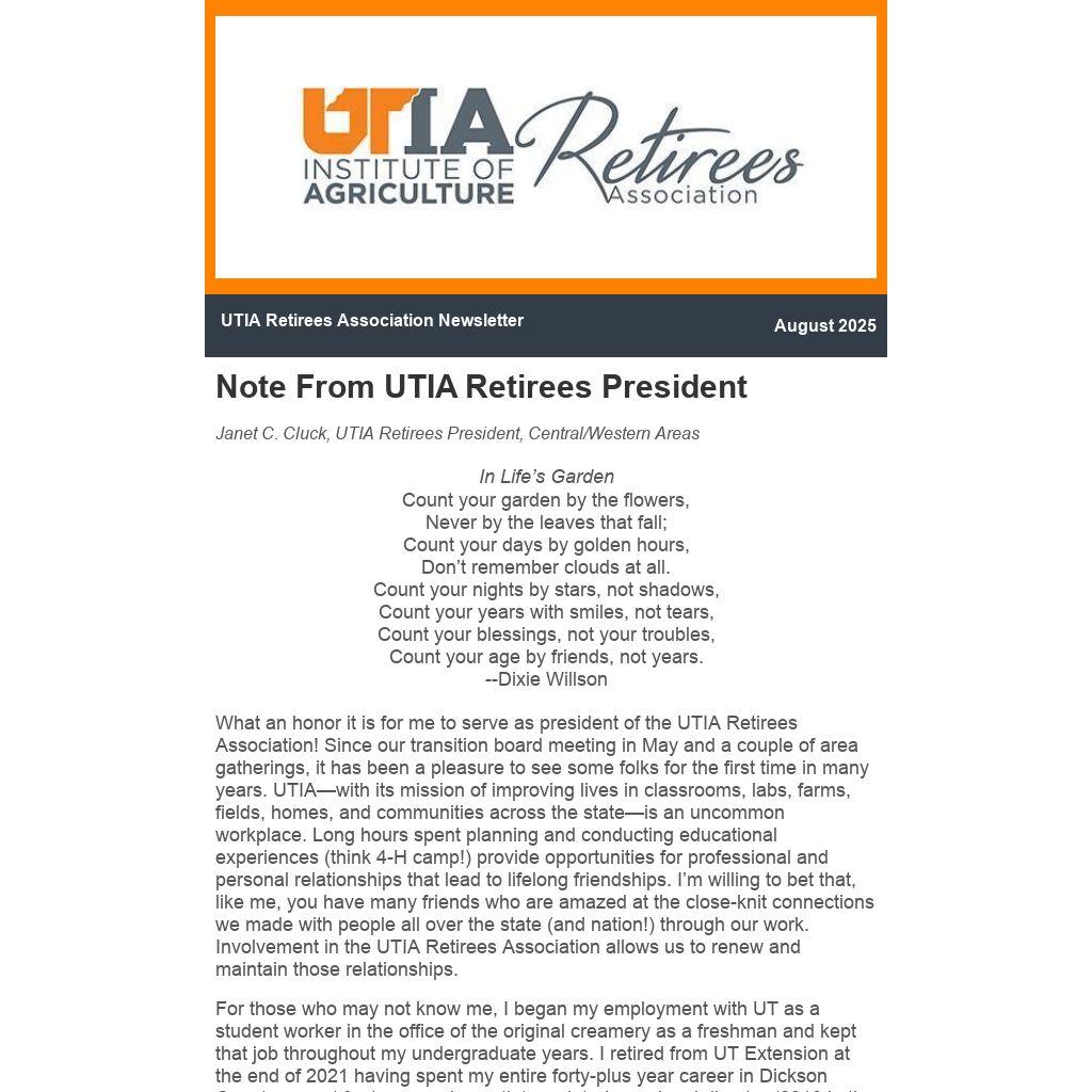 What an honor it is for me to serve as president of the UTIA Retirees Association! Since our transition board meeting in May and a couple of area gatherings, it has been a pleasure to see some folks for the first time in many years. UTIA—with its mission of improving lives in classrooms, labs, farms, fields, homes, and communities across the state—is an uncommon workplace. Long hours spent planning and conducting educational experiences (think 4-H camp!) provide opportunities for professional and personal relationships that lead to lifelong friendships. I’m willing to bet that, like me, you have many friends who are amazed at the close-knit connections we made with people all over the state (and nation!) through our work. Involvement in the UTIA Retirees Association allows us to renew and maintain those relationships.