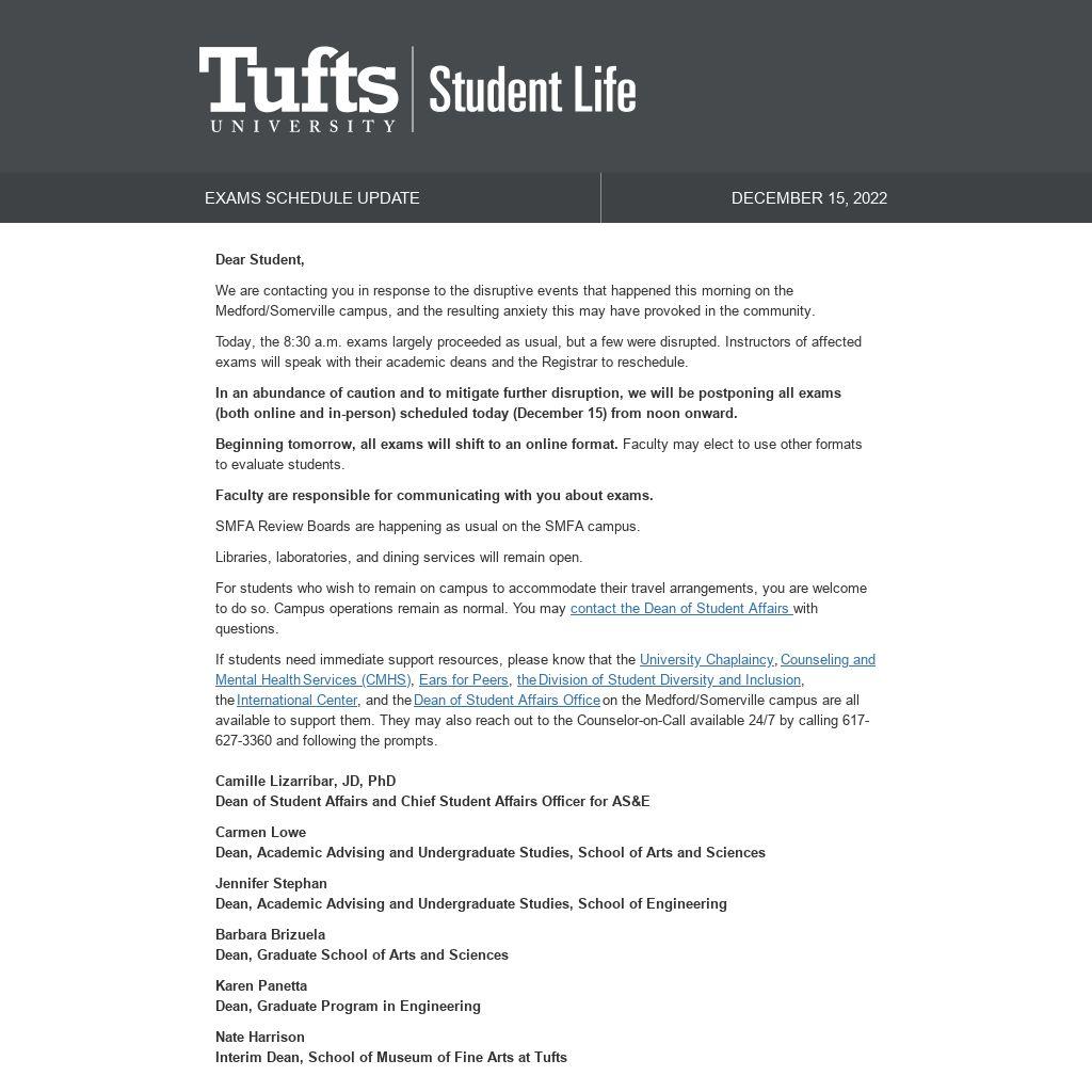 We are contacting you in response to the disruptive events that happened this morning on the Medford/Somerville campus, and the resulting anxiety this may have provoked in the community.