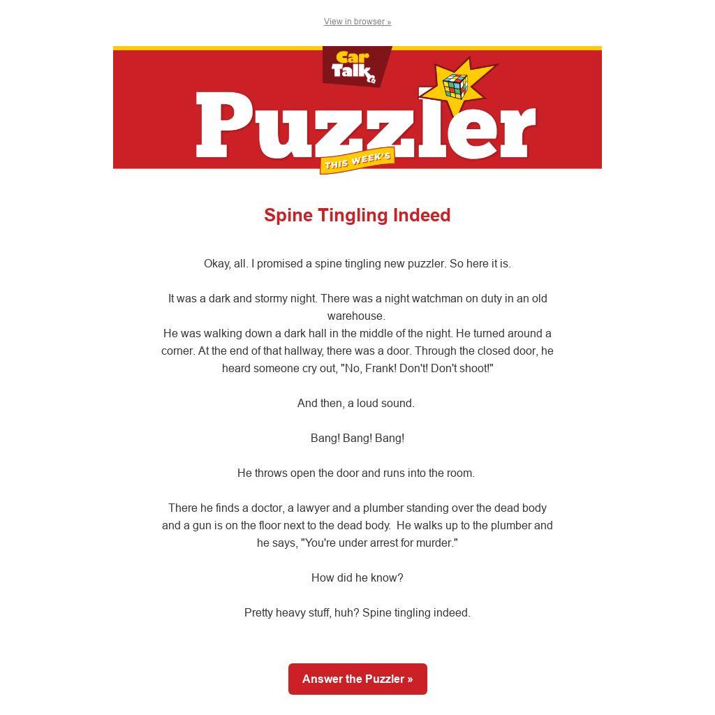 Okay, all. I promised a spine tingling new puzzler. So here it is.