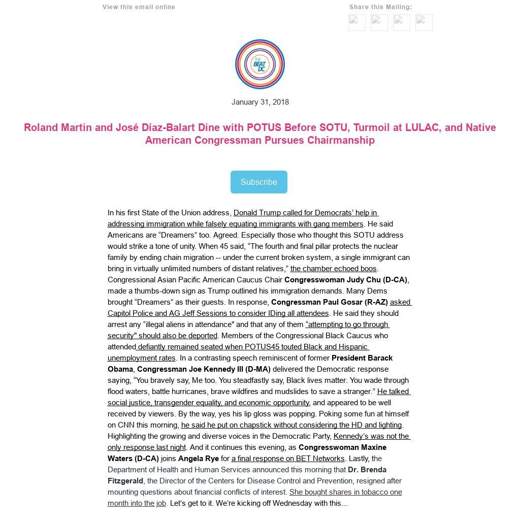 In his first State of the Union address, Donald Trump called for Democrats’ help in addressing immigration while falsely equating immigrants with gang members. He said Americans are “Dreamers” too. Agreed. Especially those who thought this SOTU address would strike a tone of unity. When 45 said, “The fourth and final pillar protects the nuclear family by ending chain migration -- under the current broken system, a single immigrant can bring in virtually unlimited numbers of distant relatives,” the chamber echoed boos. Congressional Asian Pacific American Caucus Chair Congresswoman Judy Chu (D-CA), made a thumbs-down sign as Trump outlined his immigration demands. Many Dems brought “Dreamers” as their guests. In response, Congressman Paul Gosar (R-AZ) asked Capitol Police and AG Jeff Sessions to consider IDing all attendees. He said they should arrest any “illegal aliens in attendance" and that any of them “attempting to go through security" should also be deported. Members of the Congressional Black Caucus who attended defiantly remained seated when POTUS45 touted Black and Hispanic unemployment rates. In a contrasting speech reminiscent of former President Barack Obama, Congressman Joe Kennedy III (D-MA) delivered the Democratic response saying, “You bravely say, Me too. You steadfastly say, Black lives matter. You wade through flood waters, battle hurricanes, brave wildfires and mudslides to save a stranger.” He talked social justice, transgender equality, and economic opportunity, and appeared to be well received by viewers. By the way, yes his lip gloss was popping. Poking some fun at himself on CNN this morning, he said he put on chapstick without considering the HD and lighting. Highlighting the growing and diverse voices in the Democratic Party, Kennedy’s was not the only response last night. And it continues this evening, as Congresswoman Maxine Waters (D-CA) joins Angela Rye for a final response on BET Networks. Lastly, the Department of Health and Human Services announced this morning that Dr. Brenda Fitzgerald, the Director of the Centers for Disease Control and Prevention, resigned after mounting questions about financial conflicts of interest. She bought shares in tobacco one month into the job. Let’s get to it. We’re kicking off Wednesday with this...