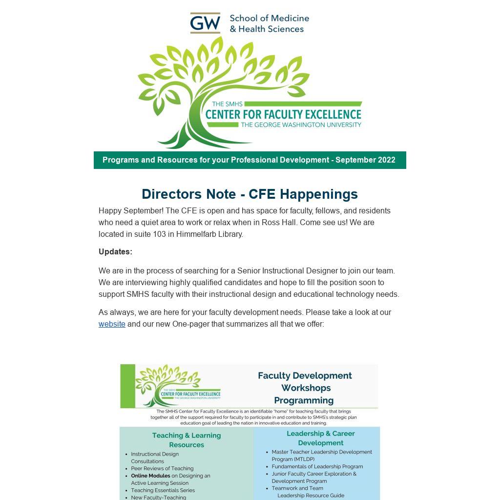 Directors Note - CFE HappeningsHappy September! The CFE is open and has space for faculty, fellows, and residents who need a quiet area to work or relax when in Ross Hall. Come see us! We are located in suite 103 in Himmelfarb Library.