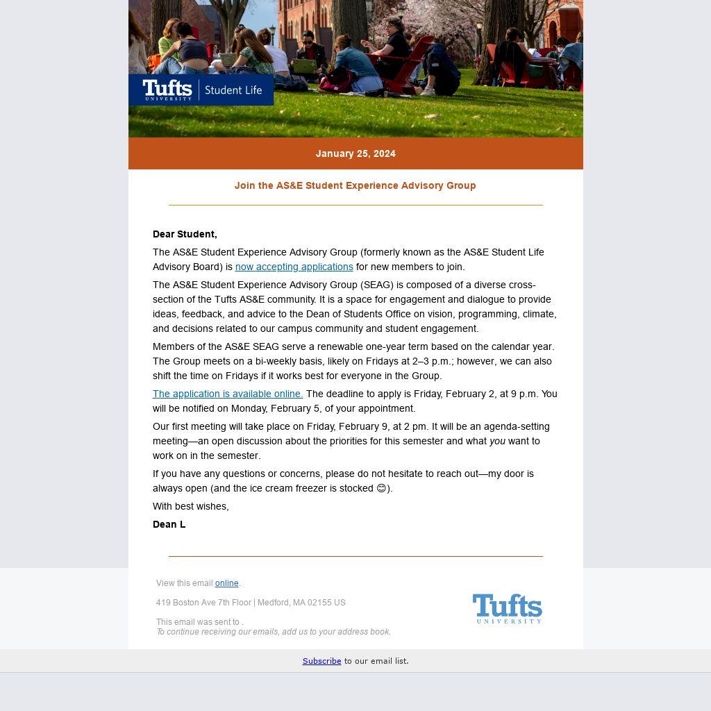 The AS&E Student Experience Advisory Group (SEAG) is composed of a diverse cross-section of the Tufts AS&E community. It is a space for engagement and dialogue to provide ideas, feedback, and advice to the Dean of Students Office on vision, programming, climate, and decisions related to our campus community and student engagement.