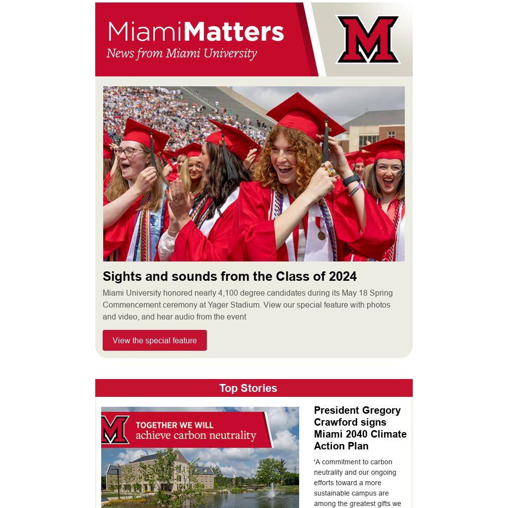 Miami University honored nearly 4,100 degree candidates during its May 18 Spring Commencement ceremony at Yager Stadium. View our special feature with photos and video, and hear audio from the event