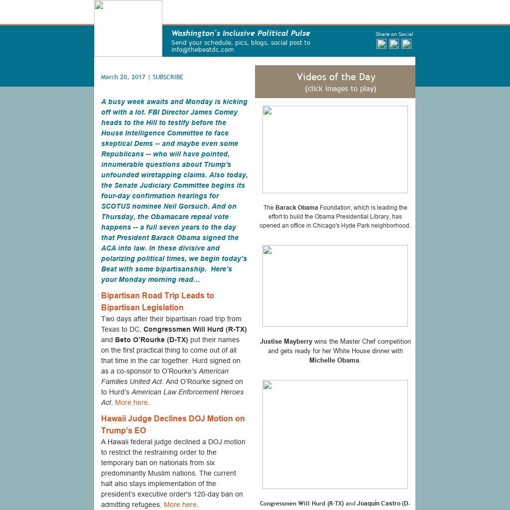 A busy week awaits and Monday is kicking off with a lot. FBI Director James Comey heads to the Hill to testify before the House Intelligence Committee to face skeptical Dems -- and maybe even some Republicans -- who will have pointed, innumerable questions about Trump's unfounded wiretapping claims. Also today, the Senate Judiciary Committee begins its four-day confirmation hearings for SCOTUS nominee Neil Gorsuch. And on Thursday, the Obamacare repeal vote happens -- a full seven years to the day that President Barack Obama signed the ACA into law. In these divisive and polarizing political times, we begin today’s Beat with some bipartisanship. Here’s your Monday morning read…