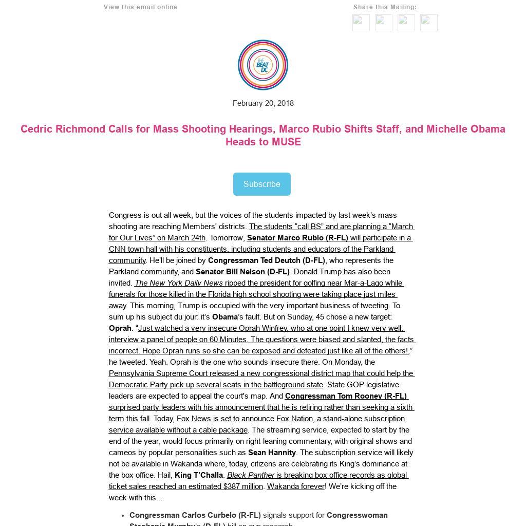 Congress is out all week, but the voices of the students impacted by last week’s mass shooting are reaching Members' districts. The students “call BS” and are planning a “March for Our Lives” on March 24th. Tomorrow, Senator Marco Rubio (R-FL) will participate in a CNN town hall with his constituents, including students and educators of the Parkland community. He’ll be joined by Congressman Ted Deutch (D-FL), who represents the Parkland community, and Senator Bill Nelson (D-FL). Donald Trump has also been invited. The New York Daily News ripped the president for golfing near Mar-a-Lago while funerals for those killed in the Florida high school shooting were taking place just miles away. This morning, Trump is occupied with the very important business of tweeting. To sum up his subject du jour: it’s Obama’s fault. But on Sunday, 45 chose a new target: Oprah. “Just watched a very insecure Oprah Winfrey, who at one point I knew very well, interview a panel of people on 60 Minutes. The questions were biased and slanted, the facts incorrect. Hope Oprah runs so she can be exposed and defeated just like all of the others!,” he tweeted. Yeah. Oprah is the one who sounds insecure there. On Monday, the Pennsylvania Supreme Court released a new congressional district map that could help the Democratic Party pick up several seats in the battleground state. State GOP legislative leaders are expected to appeal the court's map. And Congressman Tom Rooney (R-FL) surprised party leaders with his announcement that he is retiring rather than seeking a sixth term this fall. Today, Fox News is set to announce Fox Nation, a stand-alone subscription service available without a cable package. The streaming service, expected to start by the end of the year, would focus primarily on right-leaning commentary, with original shows and cameos by popular personalities such as Sean Hannity. The subscription service will likely not be available in Wakanda where, today, citizens are celebrating its King’s dominance at the box office. Hail, King T’Challa. Black Panther is breaking box office records as global ticket sales reached an estimated $387 million. Wakanda forever! We’re kicking off the week with this...
