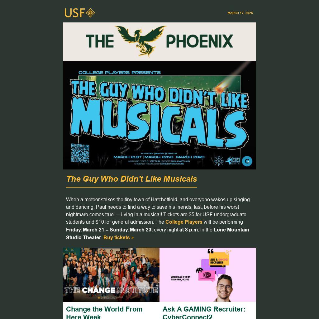 The Phoenix is a weekly e-newsletter sent by Student Leadership and Engagement to help students stay connected and get involved. It features campus events, leadership opportunities, athletic games, workshops, retreats, and more. Why “The Phoenix” title? The Phoenix has long been associated with the history and growth of USF as well as St. Ignatius, who encouraged followers to “go forth and set the world on fire.” Learn more »
