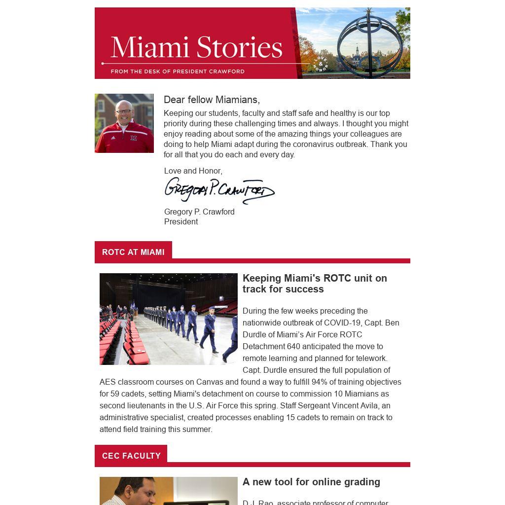 During the few weeks preceding the nationwide outbreak of COVID-19, Capt. Ben Durdle of Miami’s Air Force ROTC Detachment 640 anticipated the move to remote learning and planned for telework. Capt. Durdle ensured the full population of AES classroom courses on Canvas and found a way to fulfill 94% of training objectives for 59 cadets, setting Miami's detachment on course to commission 10 Miamians as second lieutenants in the U.S. Air Force this spring. Staff Sergeant Vincent Avila, an administrative specialist, created processes enabling 15 cadets to remain on track to attend field training this summer.