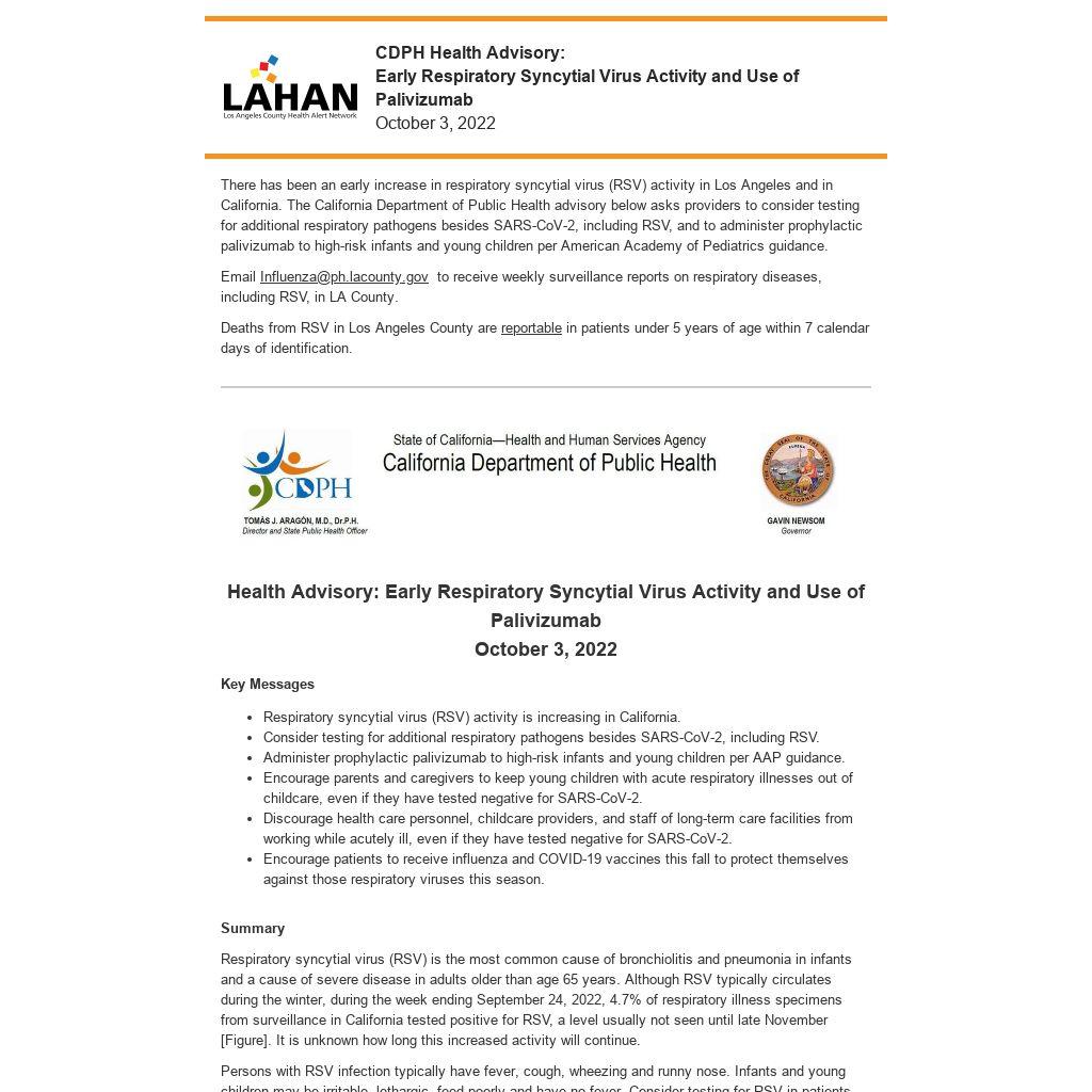 Respiratory syncytial virus (RSV) is the most common cause of bronchiolitis and pneumonia in infants and a cause of severe disease in adults older than age 65 years. Although RSV typically circulates during the winter, during the week ending September 24, 2022, 4.7% of respiratory illness specimens from surveillance in California tested positive for RSV, a level usually not seen until late November [Figure]. It is unknown how long this increased activity will continue.