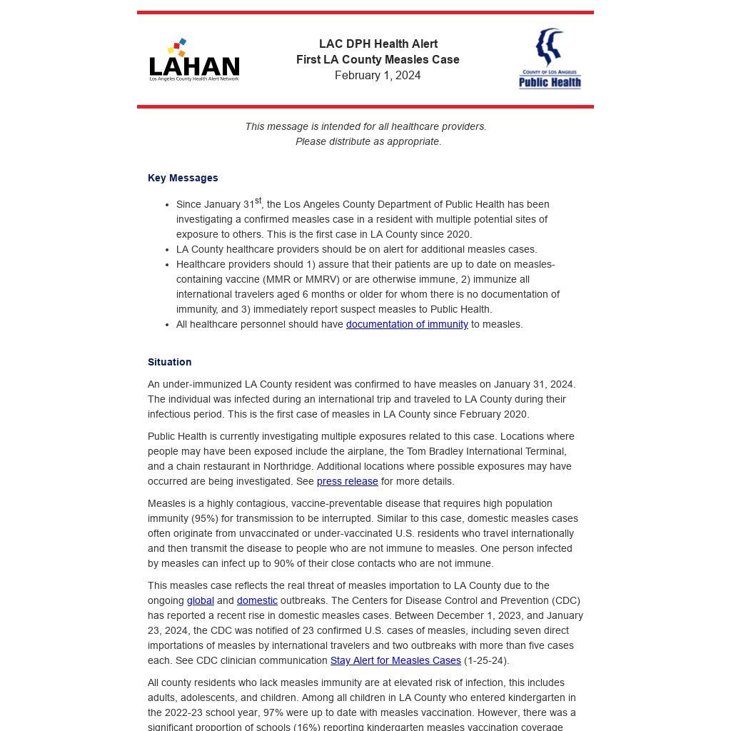 - Since January 31st, the Los Angeles County Department of Public Health has been investigating a confirmed measles case in a resident with multiple potential sites of exposure to others. This is the first case in LA County since 2020.