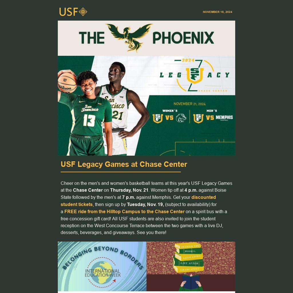 The Phoenix is a weekly e-newsletter sent by Student Leadership and Engagement to help students stay connected and get involved. It features campus events, leadership opportunities, athletic games, workshops, retreats, and more. Why “The Phoenix” title? The Phoenix has long been associated with the history and growth of USF as well as St. Ignatius, who encouraged followers to “go forth and set the world on fire.” Learn more »