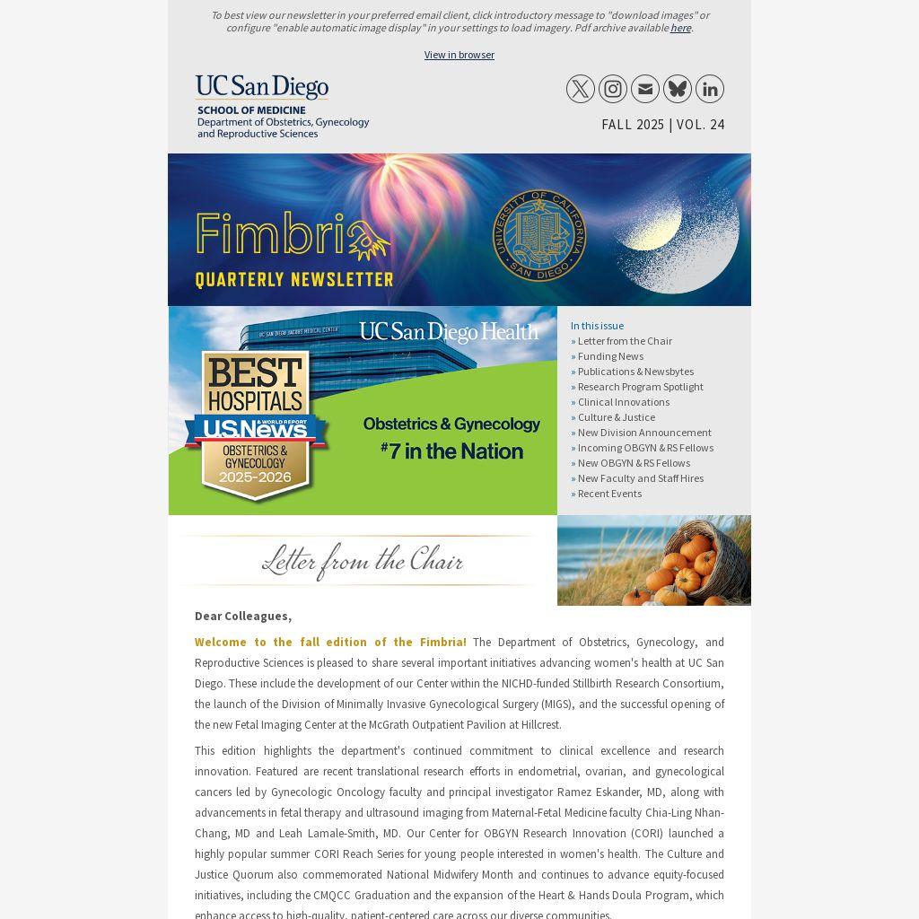 Welcome to the fall edition of the Fimbria! The Department of Obstetrics, Gynecology, and Reproductive Sciences is pleased to share several important initiatives advancing women's health at UC San Diego. These include the development of our Center within the NICHD-funded Stillbirth Research Consortium, the launch of the Division of Minimally Invasive Gynecological Surgery (MIGS), and the successful opening of the new Fetal Imaging Center at the McGrath Outpatient Pavilion at Hillcrest.