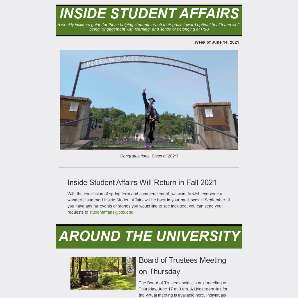 Huge thanks to Alex Miller and others who have contributed to this effort, writing pieces, contributing information and ideas, and sharing personal stories. Mostly, thanks to all of you for taking time to read and connect. Signing off for now and looking forward to seeing you all back here in the pages of Inside Student Affairs in September 2021!