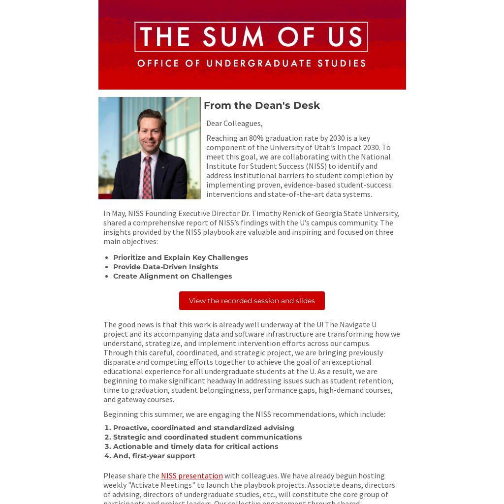 Please share the NISS presentation with colleagues. We have already begun hosting weekly "Activate Meetings" to launch the playbook projects. Associate deans, directors of advising, directors of undergraduate studies, etc., will constitute the core group of participants and project leaders. Our collective engagement through shared responsibility will be critical to our success.