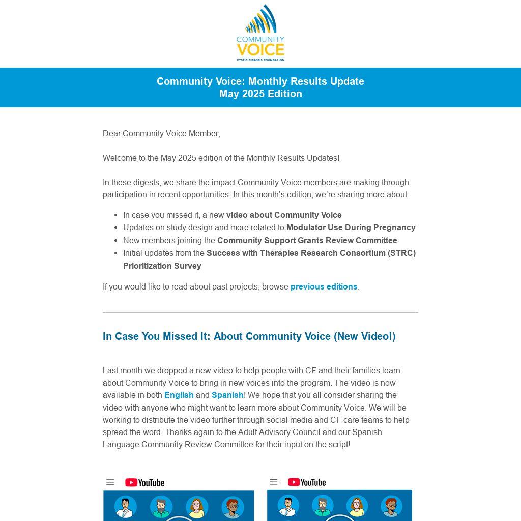 Community Voice members have supported recent and ongoing work shaping the development of research on using modulators to treat the developing fetus with CF in people who do not have CF but carry a CF mutation (pregnant CF carriers). Read on to learn how parents of children with CF are informing study design and educational materials to advance scientific and patient understanding in this emerging space.