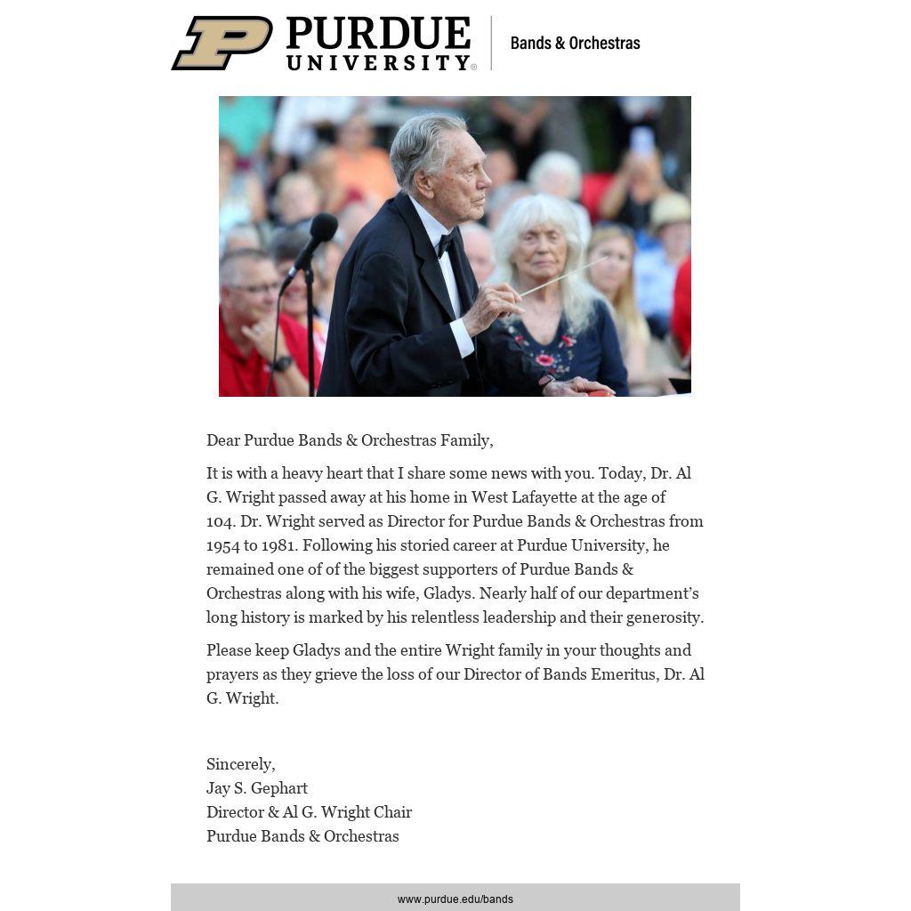 It is with a heavy heart that I share some news with you. Today, Dr. Al G. Wright passed away at his home in West Lafayette at the age of 104. Dr. Wright served as Director for Purdue Bands & Orchestras from 1954 to 1981. Following his storied career at Purdue University, he remained one of of the biggest supporters of Purdue Bands & Orchestras along with his wife, Gladys. Nearly half of our department’s long history is marked by his relentless leadership and their generosity.