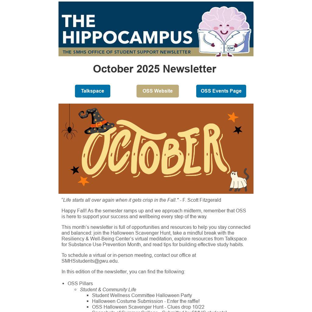This month’s newsletter is full of opportunities and resources to help you stay connected and balanced: join the Halloween Scavenger Hunt, take a mindful break with the Resiliency & Well-Being Center’s virtual meditation, explore resources from Talkspace for Substance Use Prevention Month, and read tips for building effective study habits.