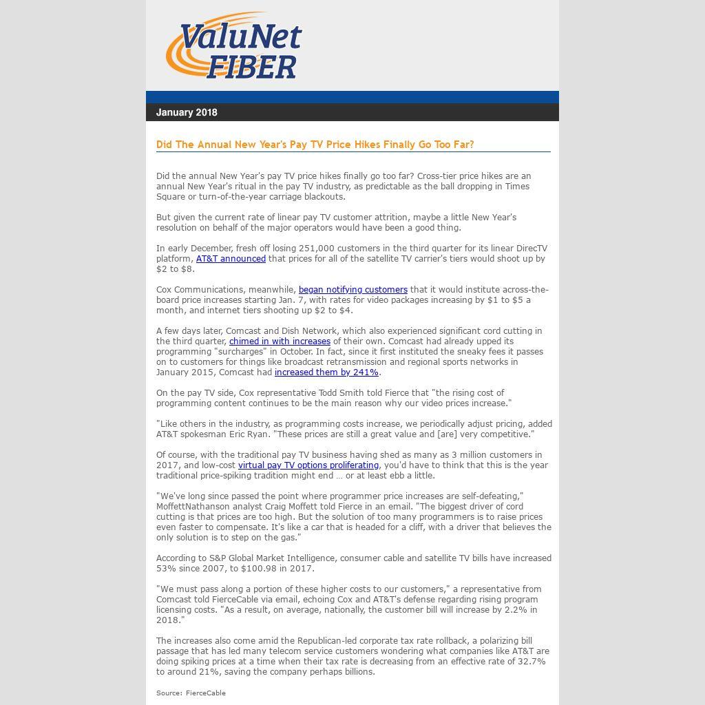 Of course, with the traditional pay TV business having shed as many as 3 million customers in 2017, and low-cost virtual pay TV options proliferating, you'd have to think that this is the year traditional price-spiking tradition might end … or at least ebb a little.