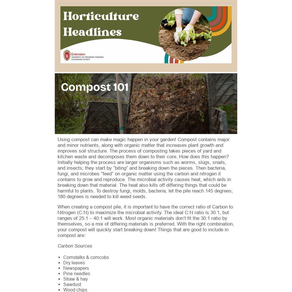 Using compost can make magic happen in your garden! Compost contains major and minor nutrients, along with organic matter that increases plant growth and improves soil structure. The process of composting takes pieces of yard and kitchen waste and decomposes them down to their core. How does this happen? Initially helping the process are larger organisms such as worms, slugs, snails, and insects; they start by “biting” and breaking down the pieces. Then bacteria, fungi, and microbes “feed” on organic matter using the carbon and nitrogen it contains to grow and reproduce. The microbial activity causes heat, which aids in breaking down that material. The heat also kills off differing things that could be harmful to plants. To destroy fungi, molds, bacteria, let the pile reach 145 degrees; 180 degrees is needed to kill weed seeds.