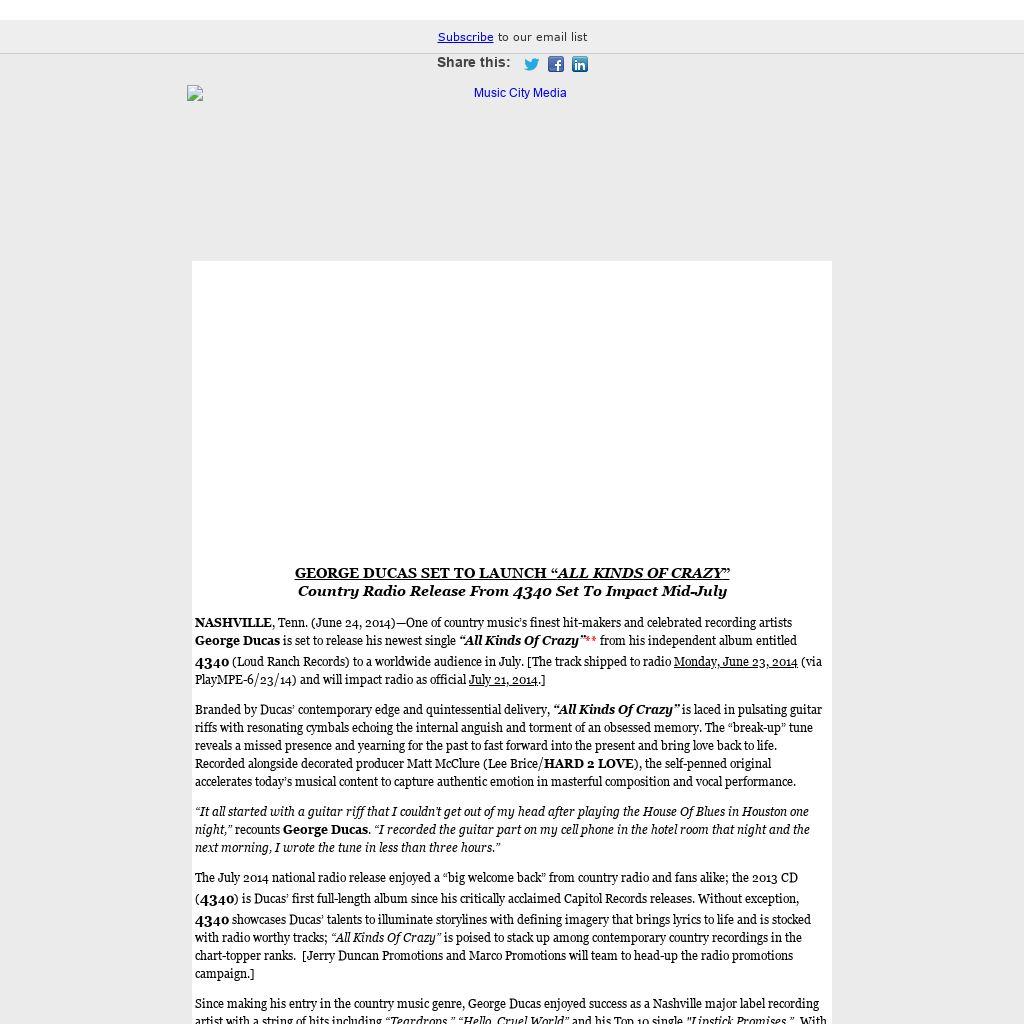 The July 2014 national radio release enjoyed a “big welcome back” from country radio and fans alike; the 2013 CD (4340) is Ducas’ first full-length album since his critically acclaimed Capitol Records releases. Without exception, 4340 showcases Ducas’ talents to illuminate storylines with defining imagery that brings lyrics to life and is stocked with radio worthy tracks; “All Kinds Of Crazy” is poised to stack up among contemporary country recordings in the chart-topper ranks. [Jerry Duncan Promotions and Marco Promotions will team to head-up the radio promotions campaign.]