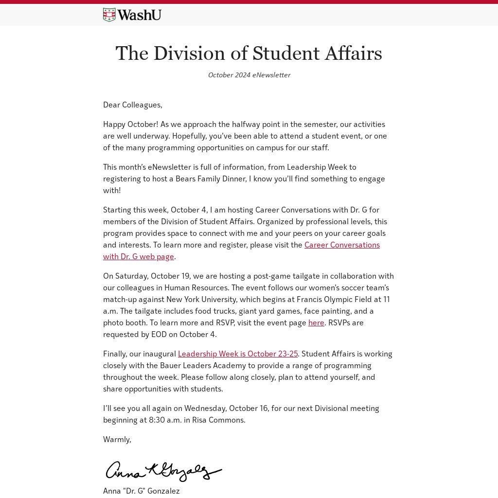 Starting this week, October 4, I am hosting Career Conversations with Dr. G for members of the Division of Student Affairs. Organized by professional levels, this program provides space to connect with me and your peers on your career goals and interests. To learn more and register, please visit the Career Conversations with Dr. G web page.