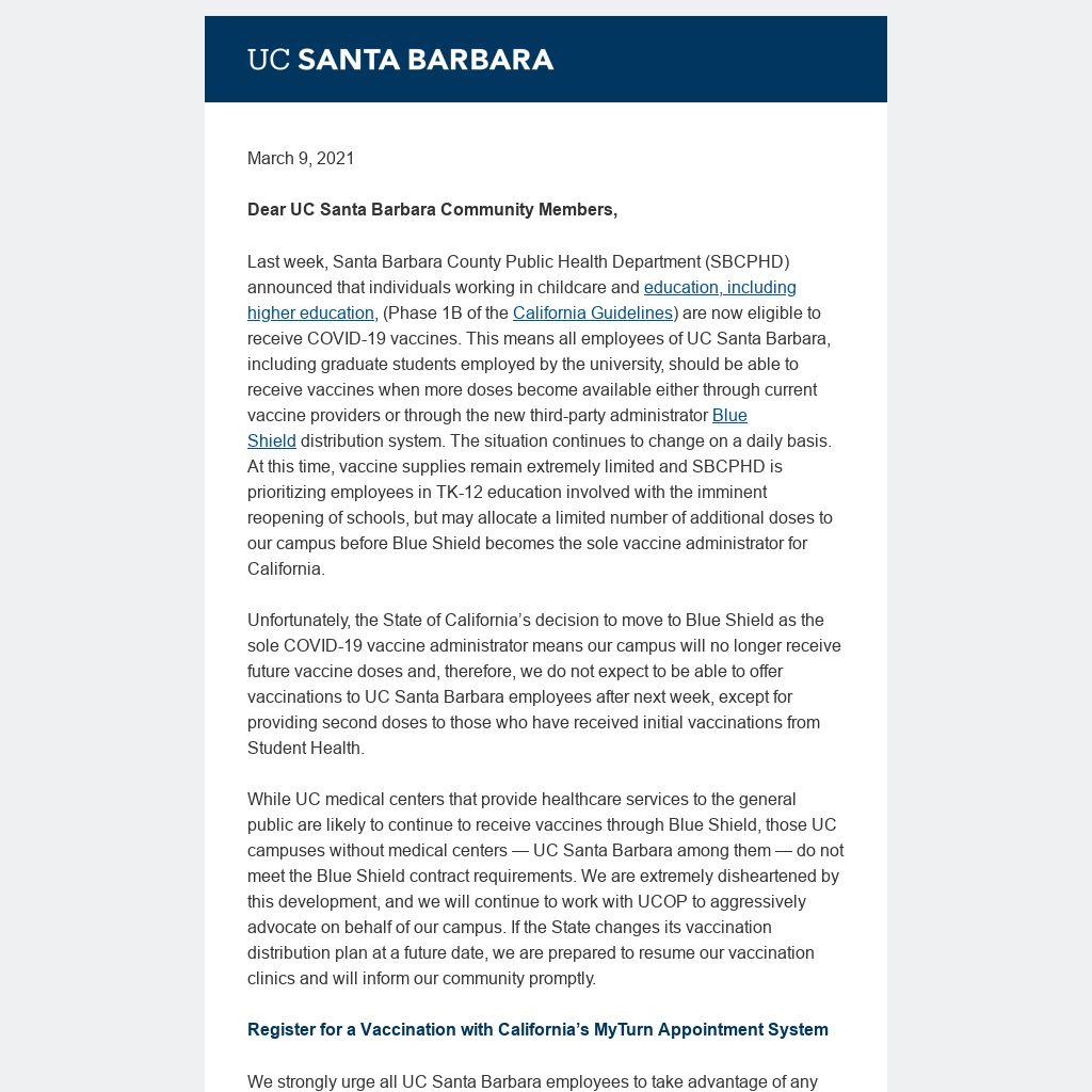 While UC medical centers that provide healthcare services to the general public are likely to continue to receive vaccines through Blue Shield, those UC campuses without medical centers — UC Santa Barbara among them — do not meet the Blue Shield contract requirements. We are extremely disheartened by this development, and we will continue to work with UCOP to aggressively advocate on behalf of our campus. If the State changes its vaccination distribution plan at a future date, we are prepared to resume our vaccination clinics and will inform our community promptly.