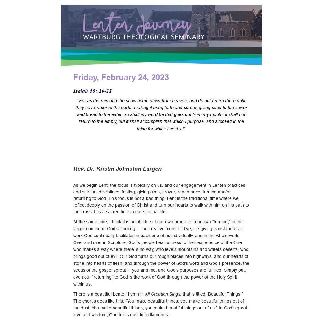 As we begin Lent, the focus is typically on us, and our engagement in Lenten practices and spiritual disciplines: fasting, giving alms, prayer, repentance, turning and/or returning to God. This focus is not a bad thing; Lent is the traditional time where we reflect deeply on the passion of Christ and turn our hearts to walk with him on his path to the cross. It is a sacred time in our spiritual life.