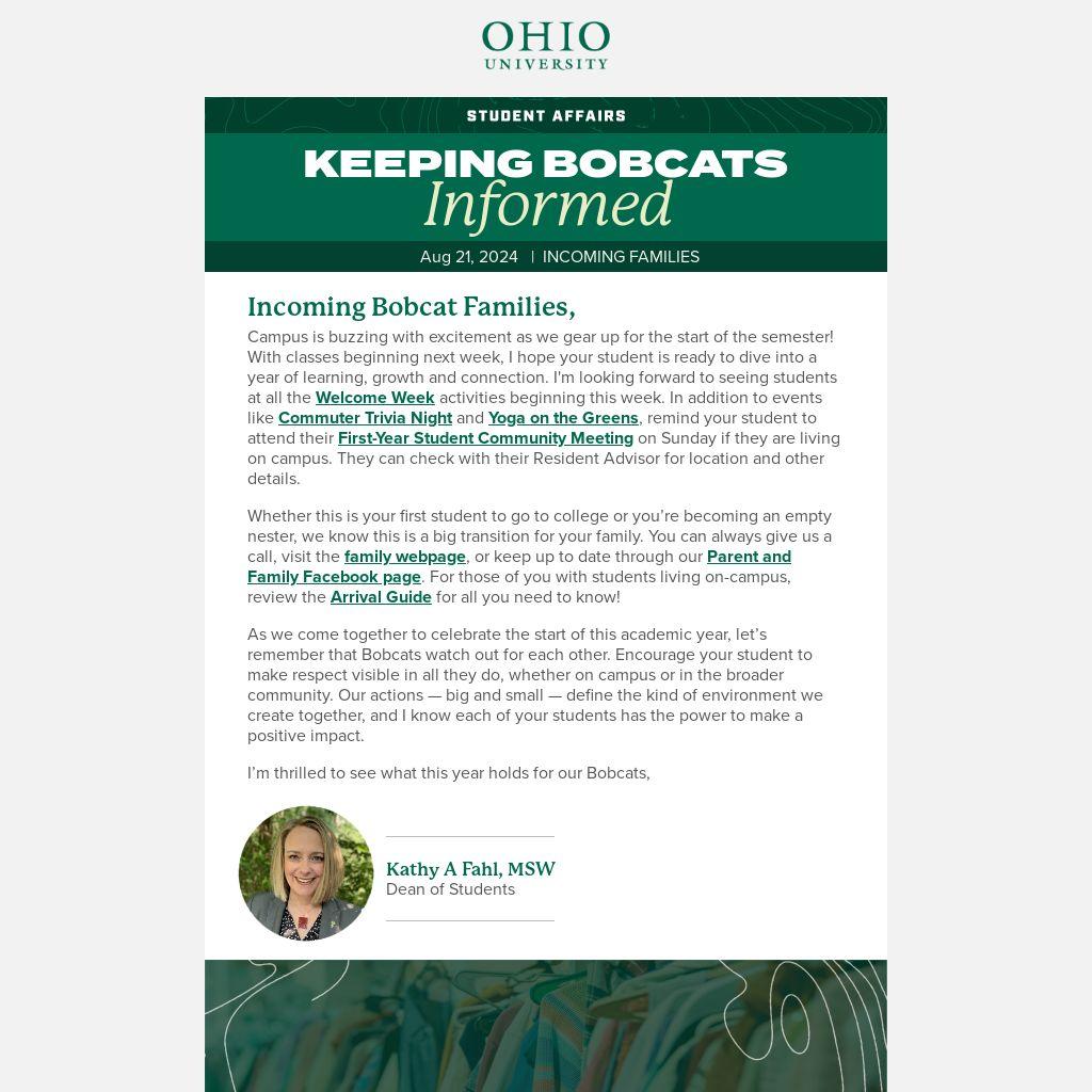 As we come together to celebrate the start of this academic year, let’s remember that Bobcats watch out for each other. Encourage your student to make respect visible in all they do, whether on campus or in the broader community. Our actions — big and small — define the kind of environment we create together, and I know each of your students has the power to make a positive impact.