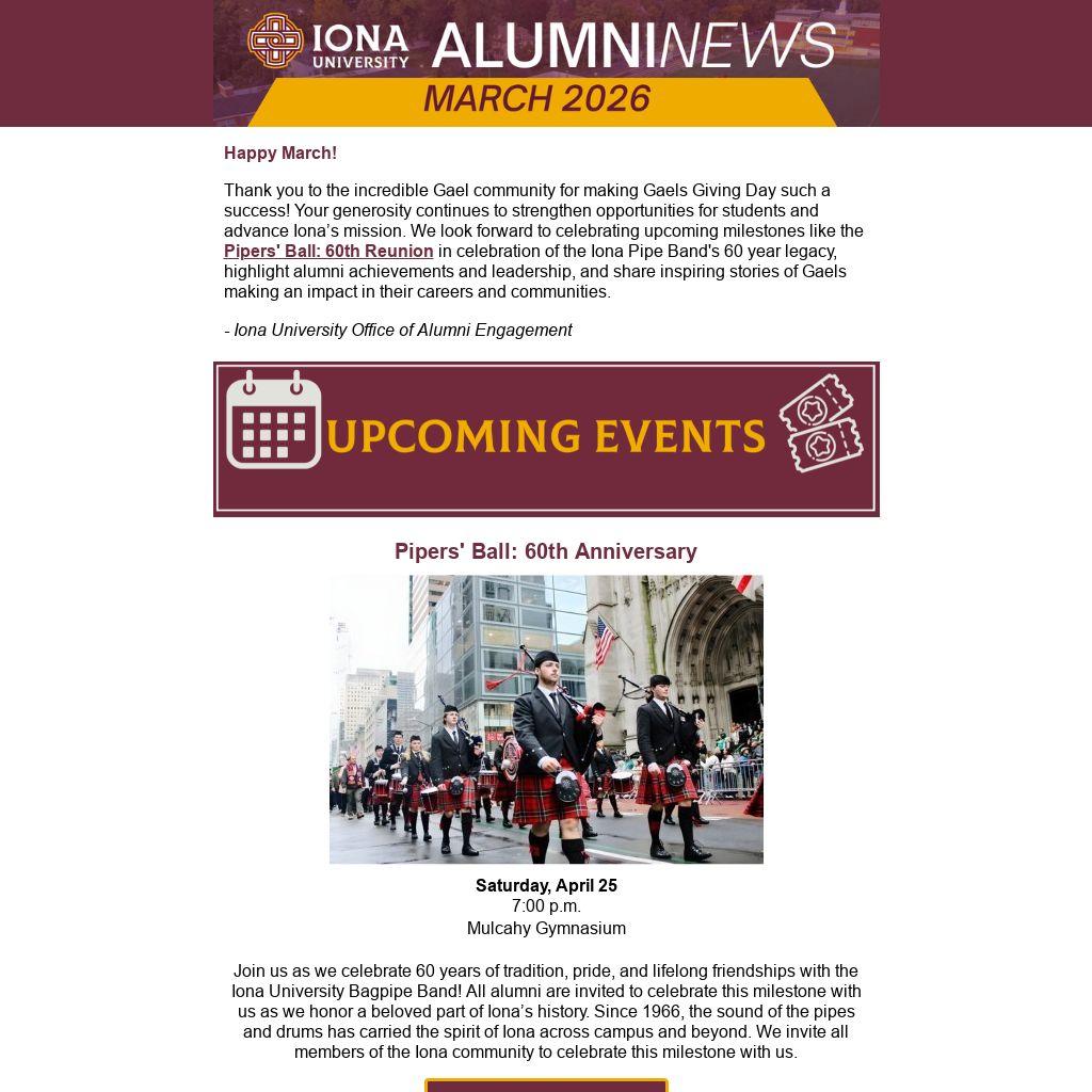 Thank you to the incredible Gael community for making Gaels Giving Day such a success! Your generosity continues to strengthen opportunities for students and advance Iona’s mission. We look forward to celebrating upcoming milestones like the Pipers' Ball: 60th Reunion in celebration of the Iona Pipe Band's 60 year legacy, highlight alumni achievements and leadership, and share inspiring stories of Gaels making an impact in their careers and communities.