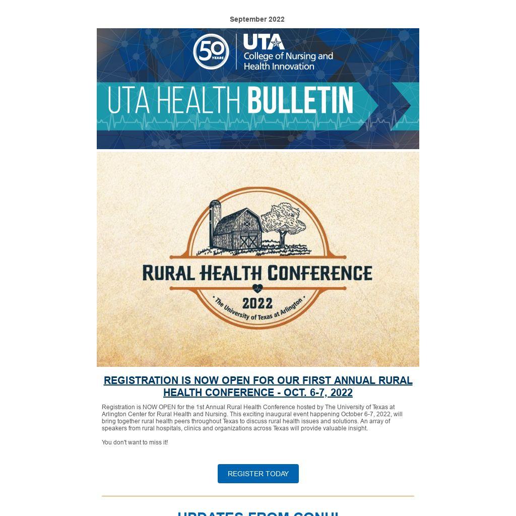 Registration is NOW OPEN for the 1st Annual Rural Health Conference hosted by The University of Texas at Arlington Center for Rural Health and Nursing. This exciting inaugural event happening October 6-7, 2022, will bring together rural health peers throughout Texas to discuss rural health issues and solutions. An array of speakers from rural hospitals, clinics and organizations across Texas will provide valuable insight. You don't want to miss it!