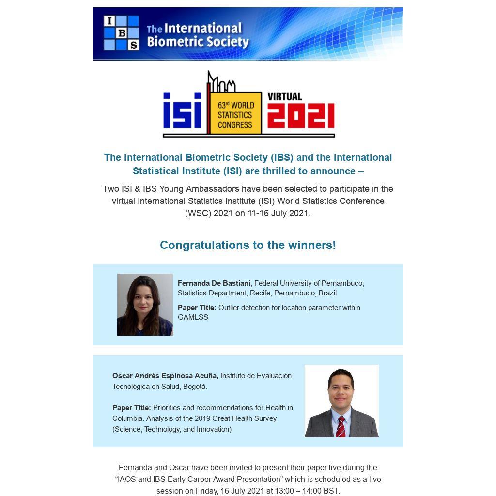 Two ISI & IBS Young Ambassadors have been selected to participate in the virtual International Statistics Institute (ISI) World Statistics Conference (WSC) 2021 on 11-16 July 2021.