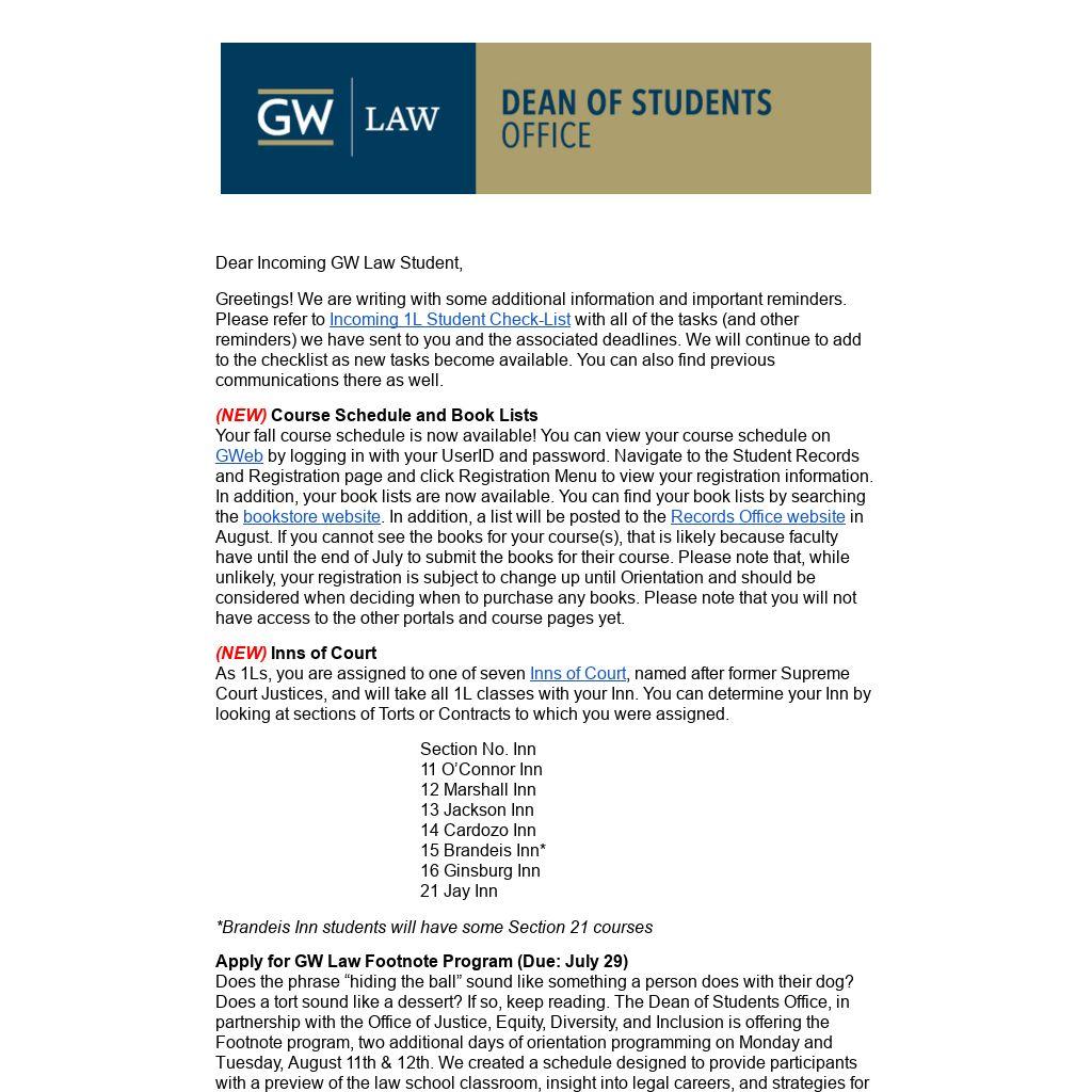 Does the phrase “hiding the ball” sound like something a person does with their dog? Does a tort sound like a dessert? If so, keep reading. The Dean of Students Office, in partnership with the Office of Justice, Equity, Diversity, and Inclusion is offering the Footnote program, two additional days of orientation programming on Monday and Tuesday, August 11th & 12th. We created a schedule designed to provide participants with a preview of the law school classroom, insight into legal careers, and strategies for maintaining balance. If you are the first lawyer in your family, or you think that you could really benefit from a little insight into what to expect in your 1L year, please fill out our Footnote application.