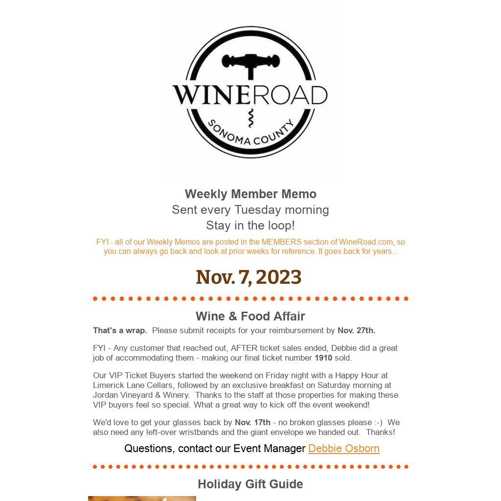 FYI - all of our Weekly Memos are posted in the MEMBERS section of WineRoad.com, so you can always go back and look at prior weeks for reference. It goes back for years...