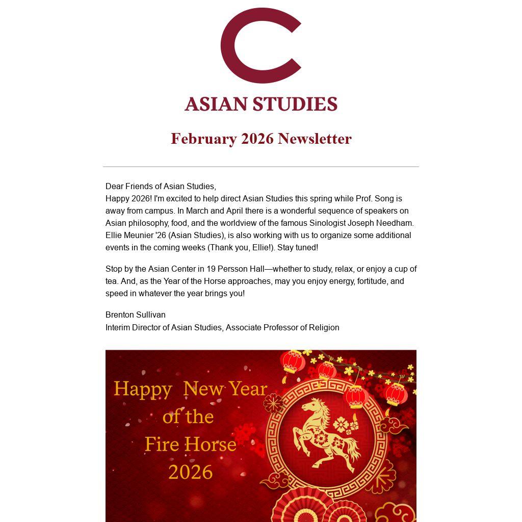 Happy 2026! I'm excited to help direct Asian Studies this spring while Prof. Song is away from campus. In March and April there is a wonderful sequence of speakers on Asian philosophy, food, and the worldview of the famous Sinologist Joseph Needham. Ellie Meunier '26 (Asian Studies), is also working with us to organize some additional events in the coming weeks (Thank you, Ellie!). Stay tuned!