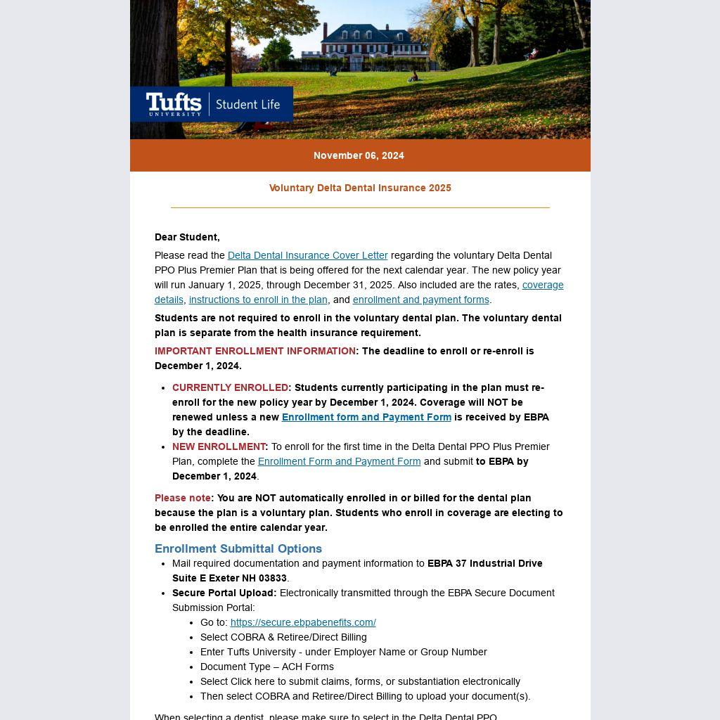 - CURRENTLY ENROLLED: Students currently participating in the plan must re-enroll for the new policy year by December 1, 2024. Coverage will NOT be renewed unless a new Enrollment form and Payment Form is received by EBPA by the deadline.