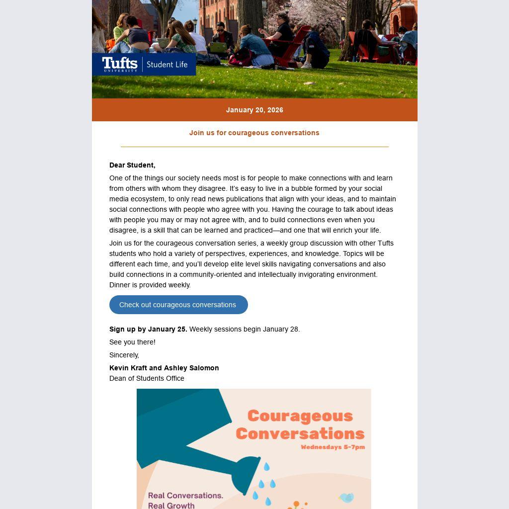 Join us for the courageous conversation series, a weekly group discussion with other Tufts students who hold a variety of perspectives, experiences, and knowledge. Topics will be different each time, and you’ll develop elite level skills navigating conversations and also build connections in a community-oriented and intellectually invigorating environment. Dinner is provided weekly.