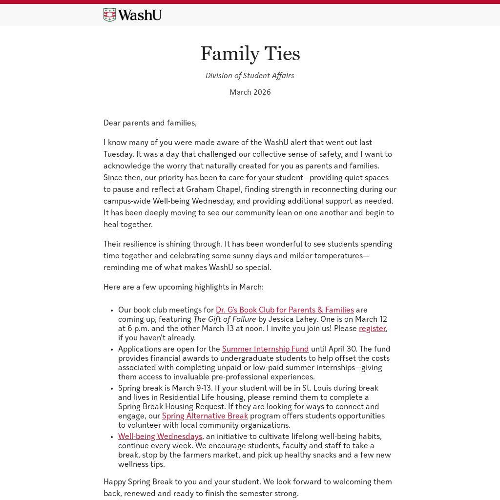 I know many of you were made aware of the WashU alert that went out last Tuesday. It was a day that challenged our collective sense of safety, and I want to acknowledge the worry that naturally created for you as parents and families. Since then, our priority has been to care for your student—providing quiet spaces to pause and reflect at Graham Chapel, finding strength in reconnecting during our campus-wide Well-being Wednesday, and providing additional support as needed. It has been deeply moving to see our community lean on one another and begin to heal together.