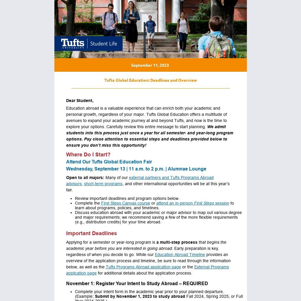 Education abroad is a valuable experience that can enrich both your academic and personal growth, regardless of your major. Tufts Global Education offers a multitude of avenues to expand your academic journey at and beyond Tufts, and now is the time to explore your options. Carefully review this entire message to start planning. We admit students into this process just once a year for all semester- and year-long program options. Pay close attention to essential steps and deadlines provided below to ensure you don’t miss this opportunity!