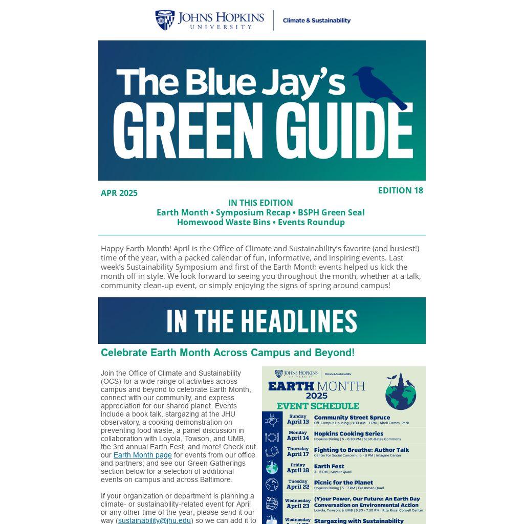 If your organization or department is planning a climate- or sustainability-related event for April or any other time of the year, please send it our way (sustainability@jhu.edu) so we can add it to our calendar of events.