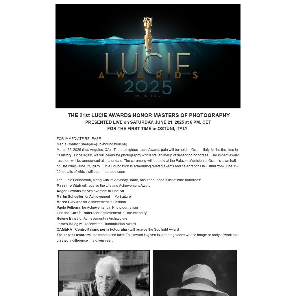 “The Lucie Awards honor the most accomplished in our field. We are proud to confer the Lucie Award on eight accomplished photographers and one organization for their extraordinary work, with one more award to be announced in a few months. Massimo Vitali is the recipient of the 2025 Lifetime Achievement Award. Later we will announce the recipient of this year’s Lucie Impact Award, to acknowledge the impact of a photograph or a body of work in a given year. We are thrilled to celebrate these extraordinary careers on June 21, at the Palazzo Municipale, in Ostuni, Italy,” said Hossein Farmani, Founder of The Lucie Awards.