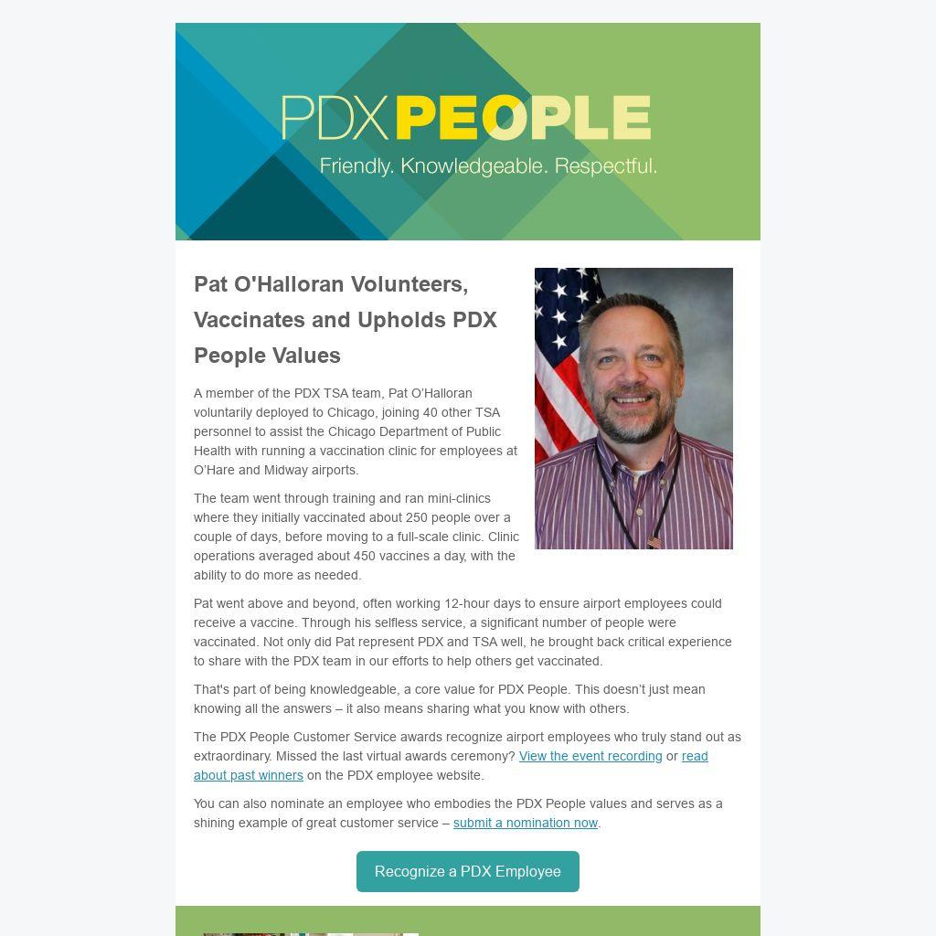 Pat went above and beyond, often working 12-hour days to ensure airport employees could receive a vaccine. Through his selfless service, a significant number of people were vaccinated. Not only did Pat represent PDX and TSA well, he brought back critical experience to share with the PDX team in our efforts to help others get vaccinated.
