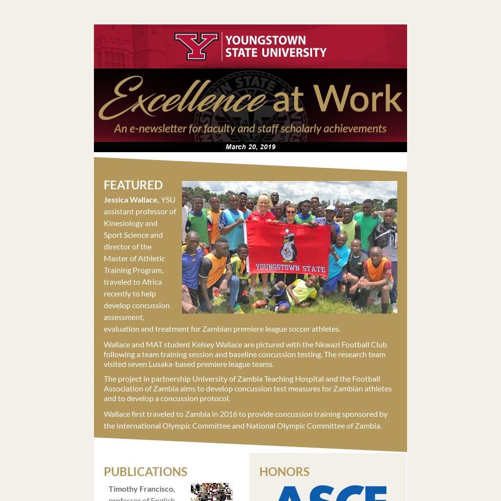 Excellence at Work, published by the YSU Office of Marketing and Communications, recognizes and celebrates the scholarly work and honors of the faculty and staff of Youngstown State University. To submit items for inclusion, complete the online form.