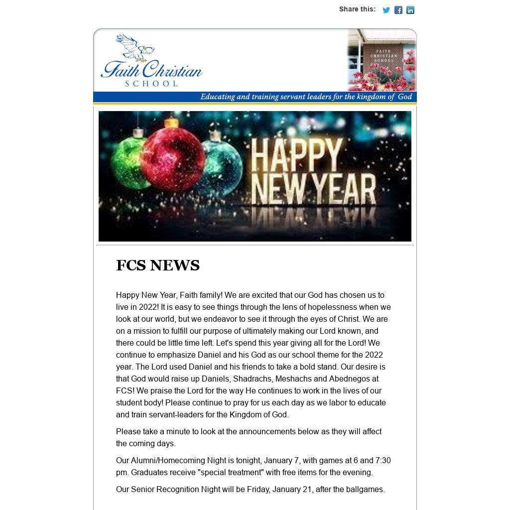Happy New Year, Faith family! We are excited that our God has chosen us to live in 2022! It is easy to see things through the lens of hopelessness when we look at our world, but we endeavor to see it through the eyes of Christ. We are on a mission to fulfill our purpose of ultimately making our Lord known, and there could be little time left. Let's spend this year giving all for the Lord! We continue to emphasize Daniel and his God as our school theme for the 2022 year. The Lord used Daniel and his friends to take a bold stand. Our desire is that God would raise up Daniels, Shadrachs, Meshachs and Abednegos at FCS! We praise the Lord for the way He continues to work in the lives of our student body! Please continue to pray for us each day as we labor to educate and train servant-leaders for the Kingdom of God.