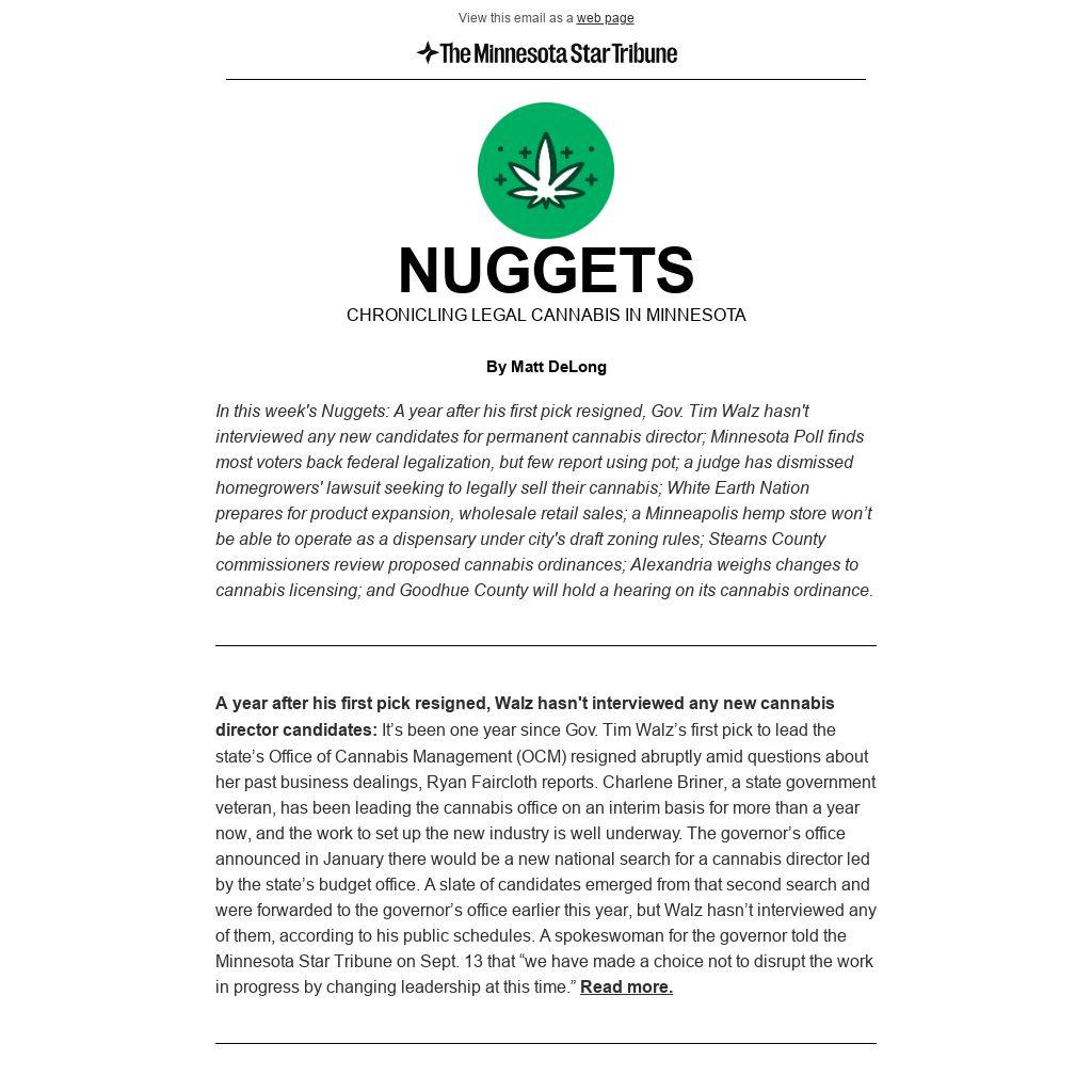 In this week's Nuggets: A year after his first pick resigned, Gov. Tim Walz hasn't interviewed any new candidates for permanent cannabis director; Minnesota Poll finds most voters back federal legalization, but few report using pot; a judge has dismissed homegrowers' lawsuit seeking to legally sell their cannabis; White Earth Nation prepares for product expansion, wholesale retail sales; a Minneapolis hemp store won’t be able to operate as a dispensary under city's draft zoning rules; Stearns County commissioners review proposed cannabis ordinances; Alexandria weighs changes to cannabis licensing; and Goodhue County will hold a hearing on its cannabis ordinance.