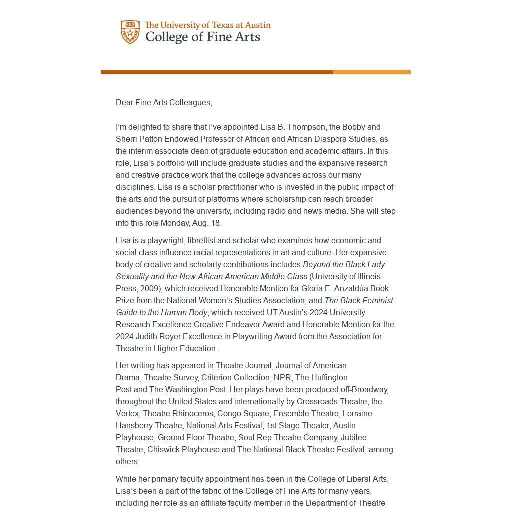 I’m delighted to share that I’ve appointed Lisa B. Thompson, the Bobby and Sherri Patton Endowed Professor of African and African Diaspora Studies, as the interim associate dean of graduate education and academic affairs. In this role, Lisa’s portfolio will include graduate studies and the expansive research and creative practice work that the college advances across our many disciplines. Lisa is a scholar-practitioner who is invested in the public impact of the arts and the pursuit of platforms where scholarship can reach broader audiences beyond the university, including radio and news media. She will step into this role Monday, Aug. 18.