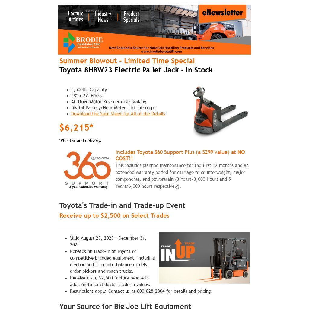 - Rebates on trade-in of Toyota or competitive branded equipment, including electric and IC counterbalance models, order pickers and reach trucks.