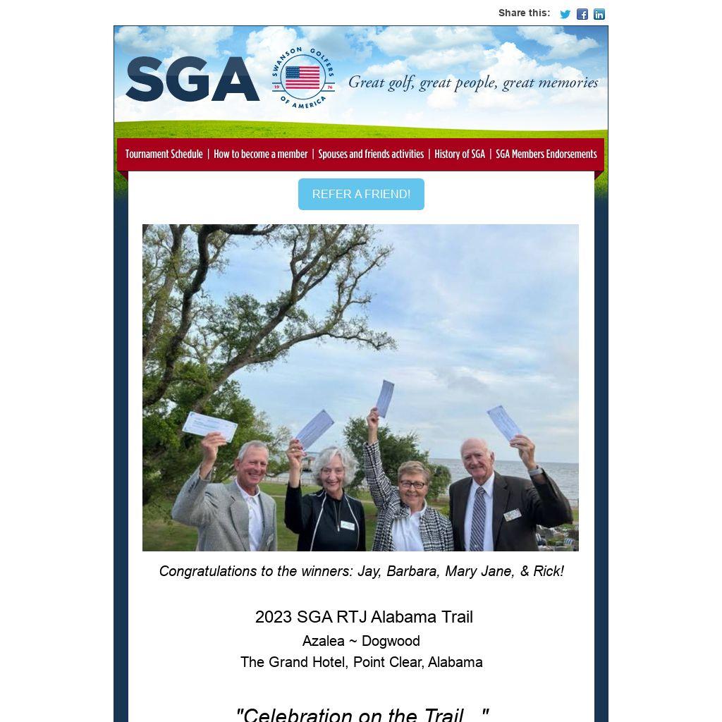 The entire Point Clear event was dedicated as a Celebration of Life for Tim Larson, beloved Lafayette SGA member who recently passed away. According to his wife Sandy (a very special SGA FoG), Tim was always trying to connect golfers, even in the hospital at the very end of his life. He and Sandy love the bay area, and have a residence nearby. Tim is dearly missed.