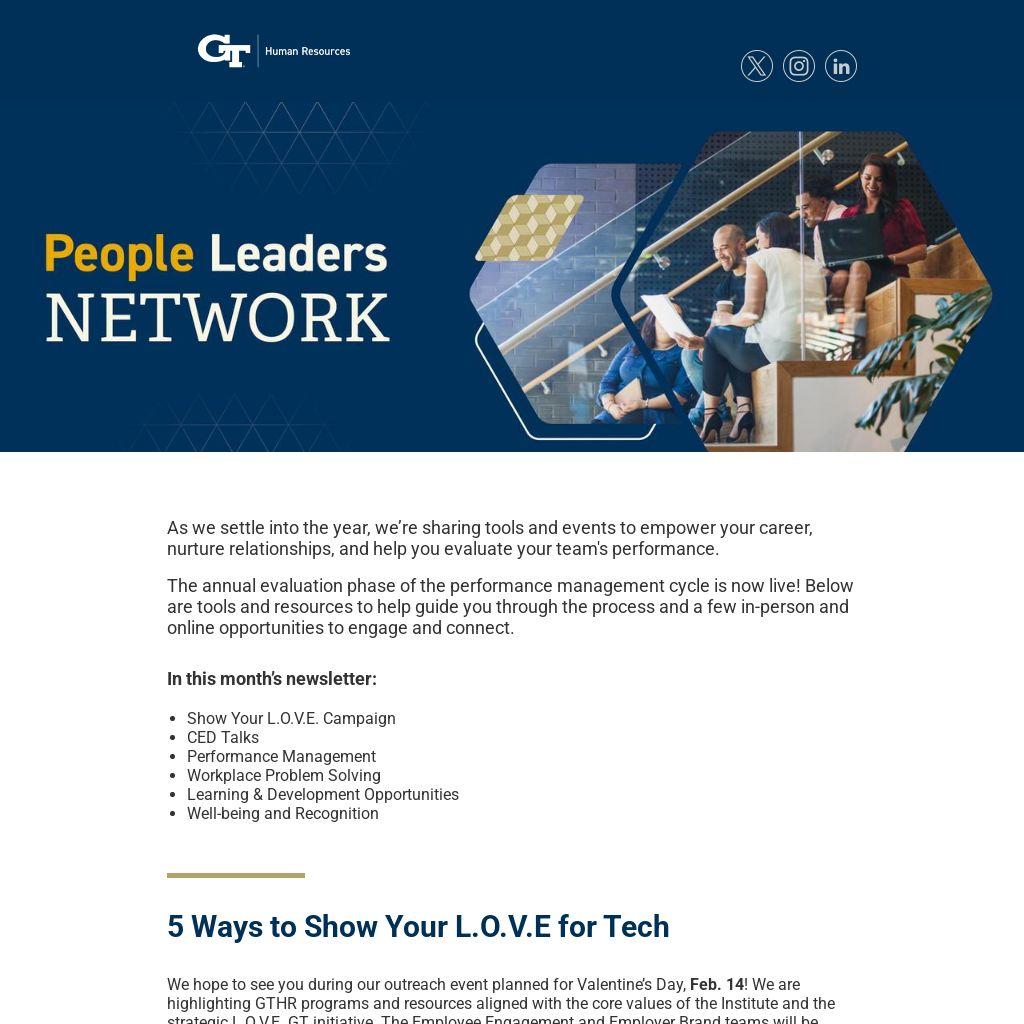 We hope to see you during our outreach event planned for Valentine’s Day, Feb. 14! We are highlighting GTHR programs and resources aligned with the core values of the Institute and the strategic L.O.V.E. GT initiative. The Employee Engagement and Employer Brand teams will be passing out cookies and materials to faculty and staff on Valentine’s Day while encouraging you to participate in the following initiatives